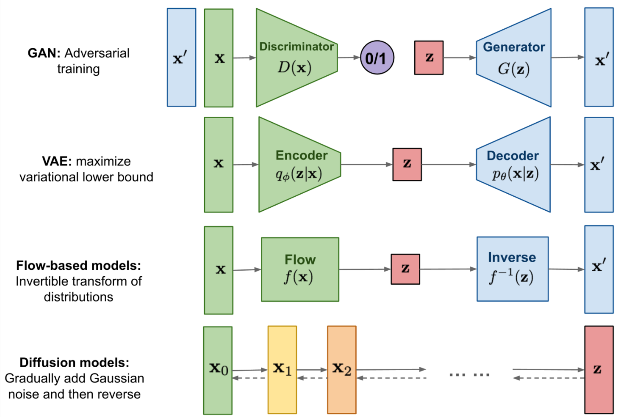 There are total 4 types of generative models GAN: Generative Adversarial Network VAE: Variational Autoencoder Flow Based Models Diffusion Models See the documentation for how to get started.